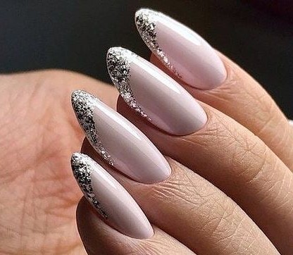 The marriage of soft pink and silver glitter in these nails speaks to a bride who holds a fondness for classic romance with a dash of sparkle. The silver-tipped gradient is a perfect match for keywords like for the bride french tip and for the bride ombre. This style offers a sophisticated length and almond shape that would be perfect for both the ceremony and the celebration that follows.