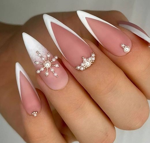 The floral motif in these nails is for the bride who delights in the delicate details of nature. The soft pink base, white floral accents, and clusters of tiny pearls capture a garden-inspired beauty, suitable for keywords such as bridal and for the bride simple. These nails, with their stiletto shape, would be a beautiful addition to an outdoor or springtime wedding.