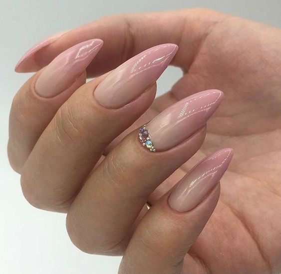 This nail design captures the beauty of minimalism with its glossy, pink-hued base and a singular, artfully placed crystal on one finger. It’s a nod to the keywords for the bride simple, for the bride almond, and cute. The nails are shaped in an elongated almond, perfect for brides who prefer a streamlined look that still commands attention. This design would look exquisite with a minimalist gown, letting the subtle shine of the nails play off the simplicity of the dress.
