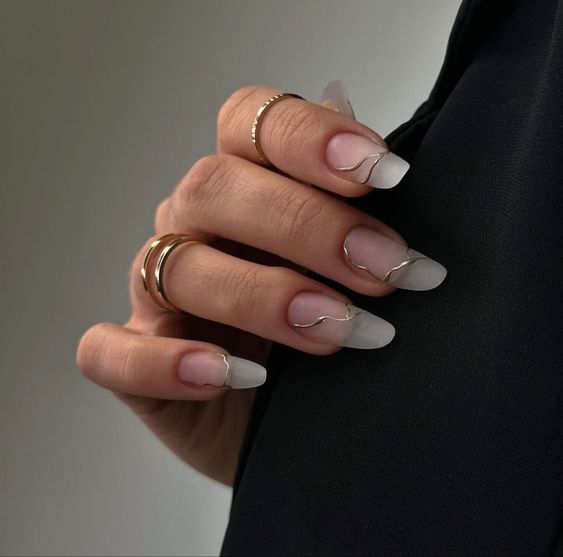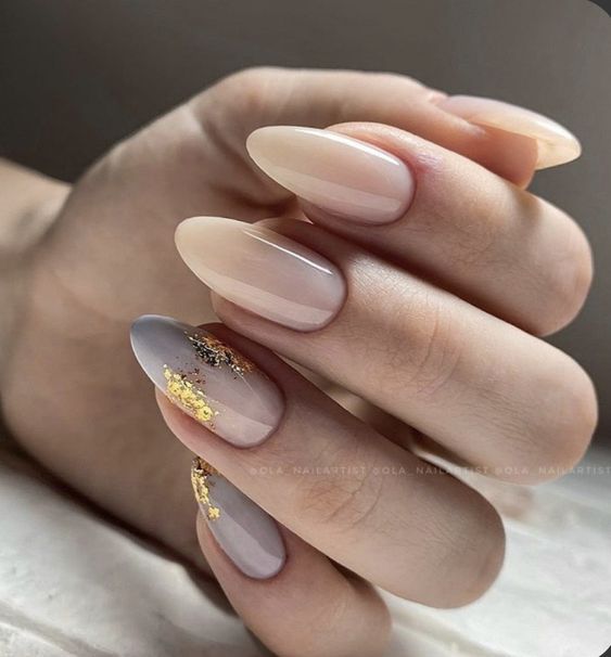 Embracing the beauty of simplicity, this oval and almond nail design showcases a sheer nude palette with occasional nails featuring a grey tint. The highlight is the subtle dusting of gold leaf, symbolizing a classy yet understated approach to bridal beauty. Perfect for the bride who adorns a for bride pink or for bride white dress, this design whispers luxury without the need for loud statements.
