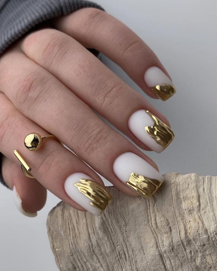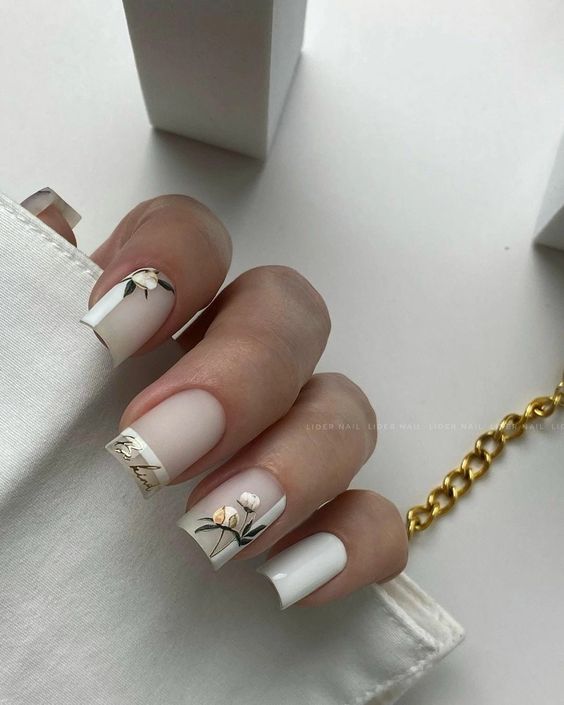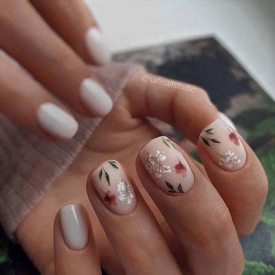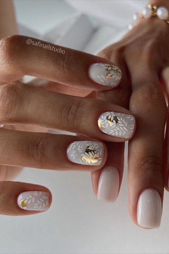 Shorter nails get their moment in the spotlight with this enchanting design. White polish serves as the canvas for delicate floral patterns, accented with hints of gold. It’s a timeless choice that mirrors the vintage flair and is perfect for the bridal look, harmonizing with a wedding classy theme.