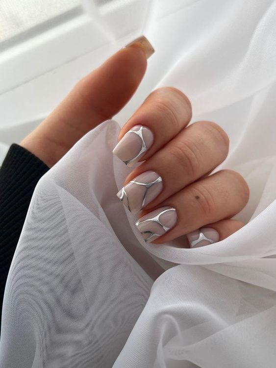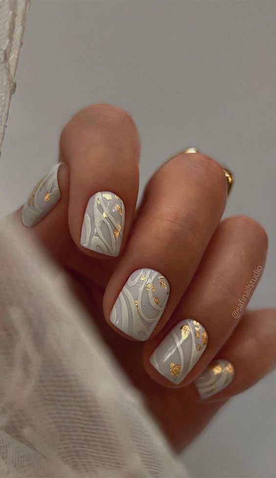 These short nails present a modern twist with fluid, wave-like patterns in gold on a white base. It’s a chic and contemporary take on wedding nail art design 2024, perfect for the bride who favors modern aesthetics with a nod to the traditional white and gold palette, suitable for a wedding day red or for bride indian theme.