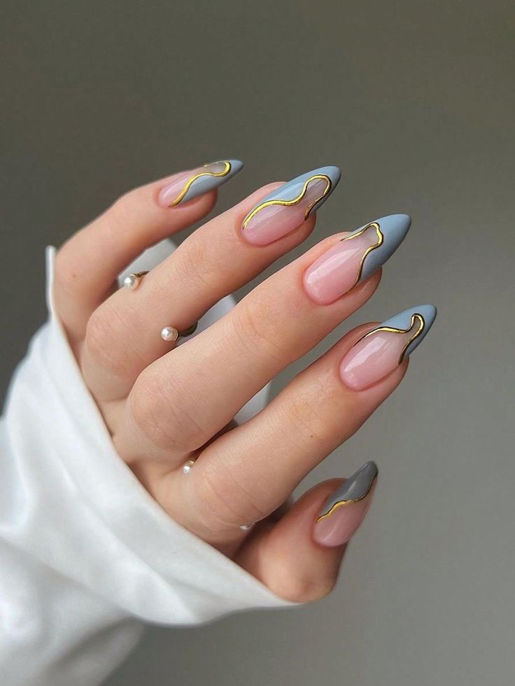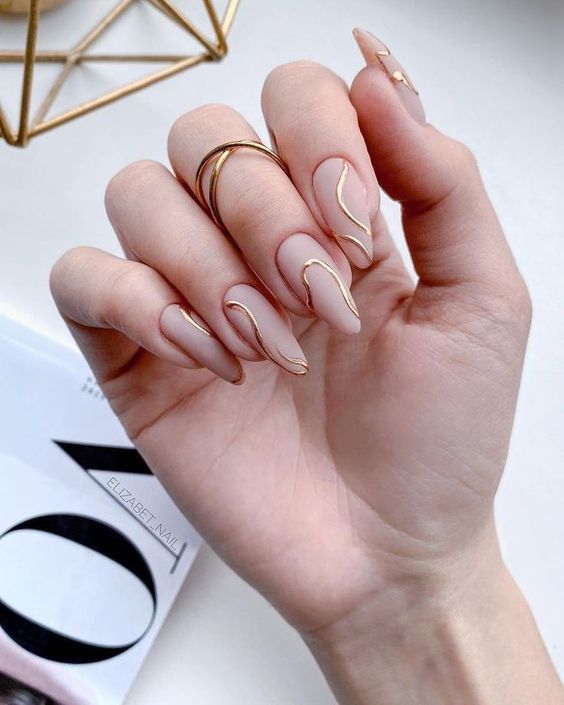 Abstract art meets bridal fashion in this ballerina-shaped nail design. Swirls of white and gold on a neutral base are the epitome of a bridal classy aesthetic that’s both modern and timeless. This design is an ideal match for the bride searching for a unique yet understated manicure that complements a wedding day red or for bride pink ensemble.