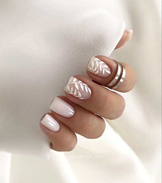 Embodying the essence of nature, this short to medium length nail design features white leaf patterns over a soft pink base. It’s a delightful match for a vintage or rustic wedding theme, resonating with a bridal classy and for wedding indian spirit.