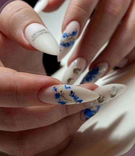 Floral designs in wedding nail art design 2024 pay homage to traditional motifs often seen in Indian bridal wear. The intricate blue and white flowers on an almond-shaped nail are a subtle yet striking choice for a bride who wants to incorporate a touch of her heritage into her look, perfect for a party or the wedding day itself.
