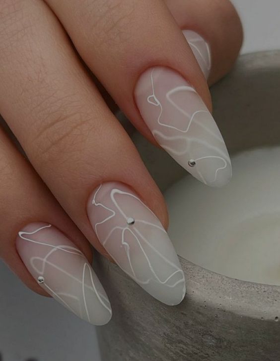 The allure of marble has always been associated with luxury and grandeur, making it a perfect fit for wedding nail art design 2024. This long, stiletto-shaped nail art features a soft white base with swirls of translucent gray, creating a marble-like effect. Adorned with a singular tiny crystal, it’s an embodiment of for bride bridal elegance, ideal for a wedding day where every detail is a whisper of sophistication.