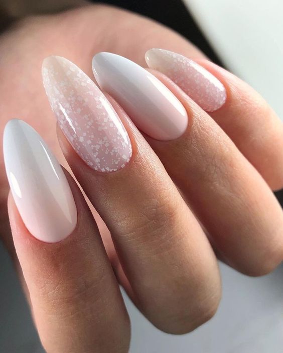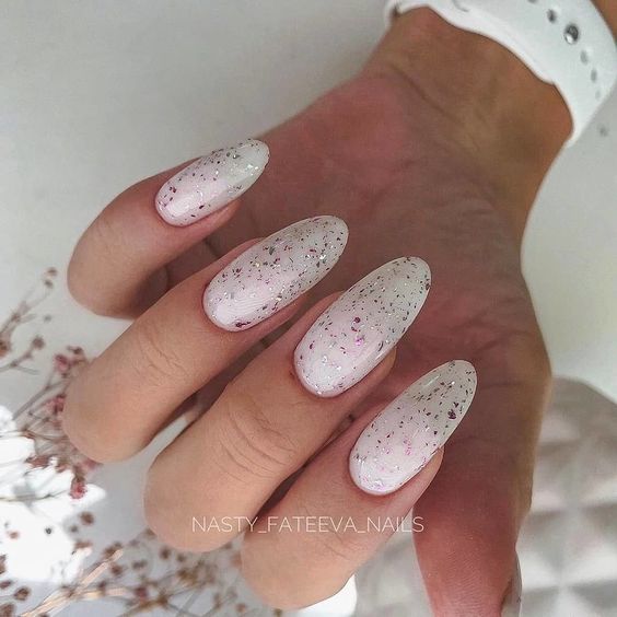 Soft as the first blush of dawn, this nail design captures the romance of a wedding day with its pink ombre background dusted with a whisper of glitter. It’s a design that combines elegance and cuteness, ideal for brides who desire a hint of whimsy. The sparkle scattered like delicate confetti suggests a celebration, making it a lovely choice for medium or almond-shaped nails. It’s an easy yet striking option that adds a dreamy touch to any bridal look.