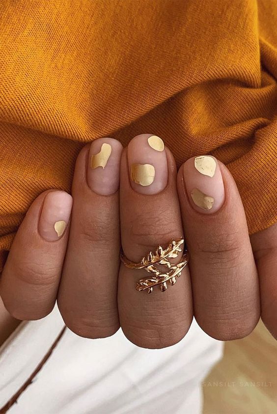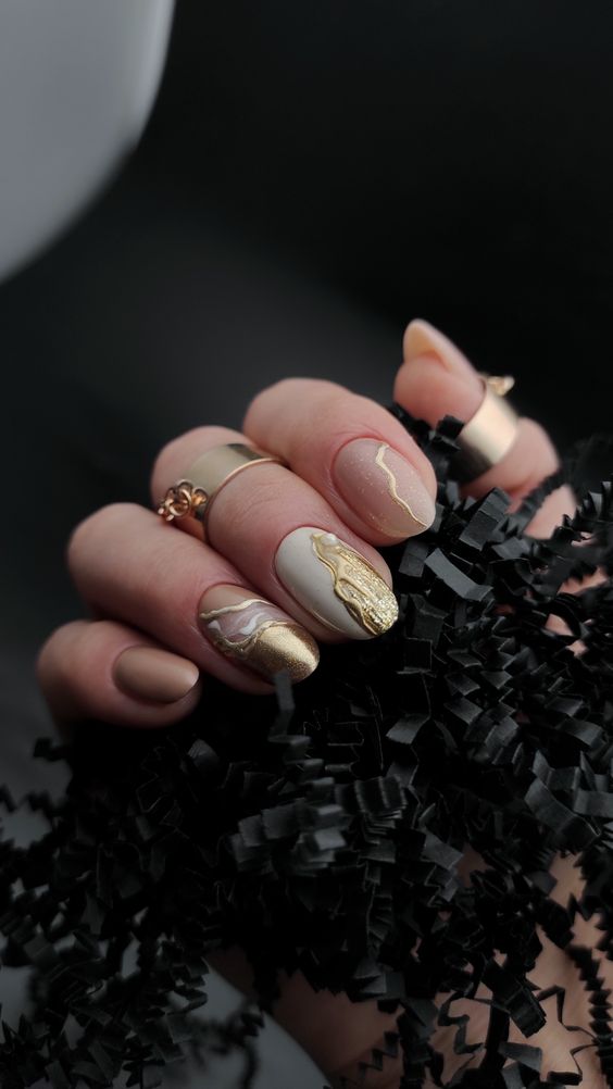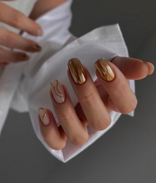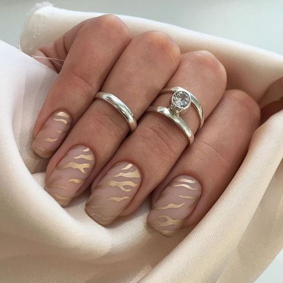 Soft, round nails with a natural finish are graced with undulating waves of gold, creating a serene and romantic vibe. This design would complement a sage green or white and rose wedding gown, offering a gentle nod to the gold wedding nails trend without overpowering the bride’s overall look.