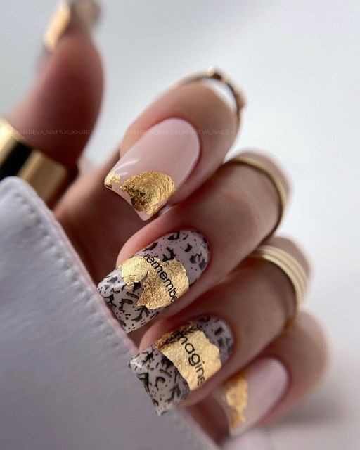 In a fusion of sage green and gold, these nails define contemporary elegance. The medium length, combined with a round silhouette, is graced with abstract gold foil over a green and nude base. It’s a design that pairs well with a burgundy and gold dress, offering a modern twist to the traditional bridal look.