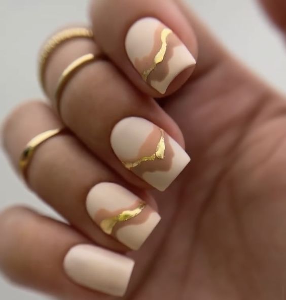 Elegance swirls on the tips of these short nails, where gold flows like liquid art. Perfect for a minimalist bride who seeks a touch of flair, these nails would complement a sage green wedding dress, adding just the right amount of luster.