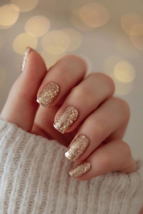 Imagine the first snow, sparkling under a golden winter sun. These medium nails, completely enveloped in gold glitter, mimic this magical sight. Suitable for a white and rose winter wedding, they bring a wonderland dream to life, especially when paired with a rose-accented gown.