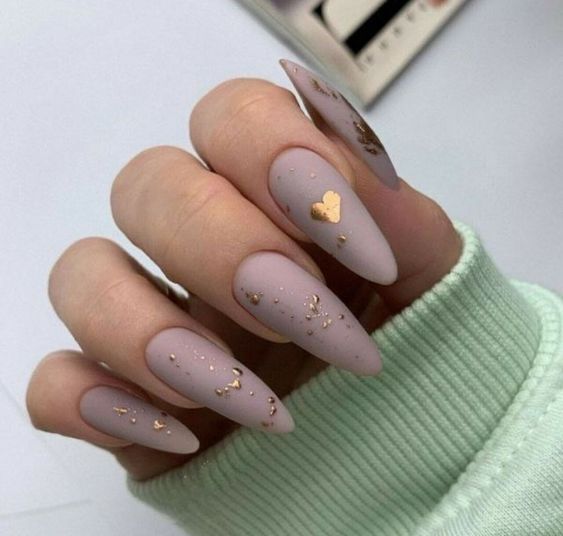 A soft lavender base sprinkled with gold flecks gives these long stiletto nails a touch of whimsy. They suggest a fairytale romance, perfect for a bride who dreams in color. These nails would harmonize beautifully with a purple and gold wedding theme.