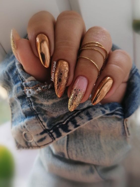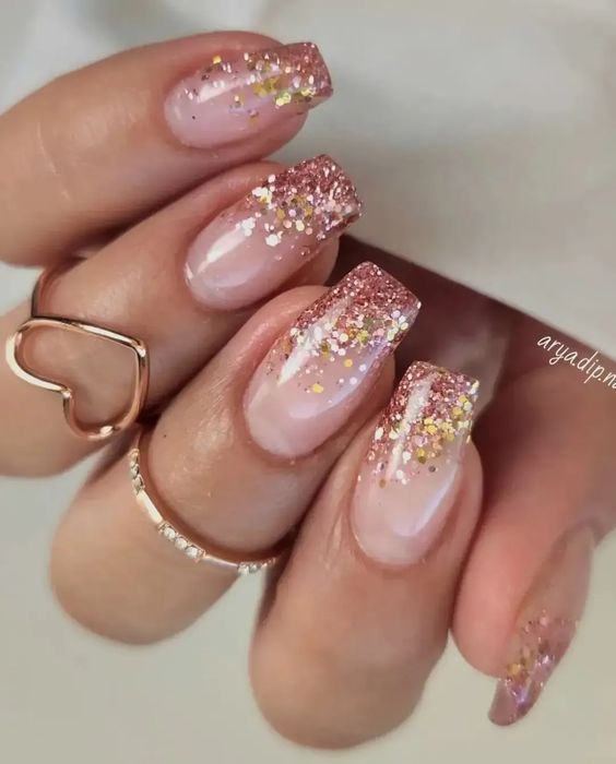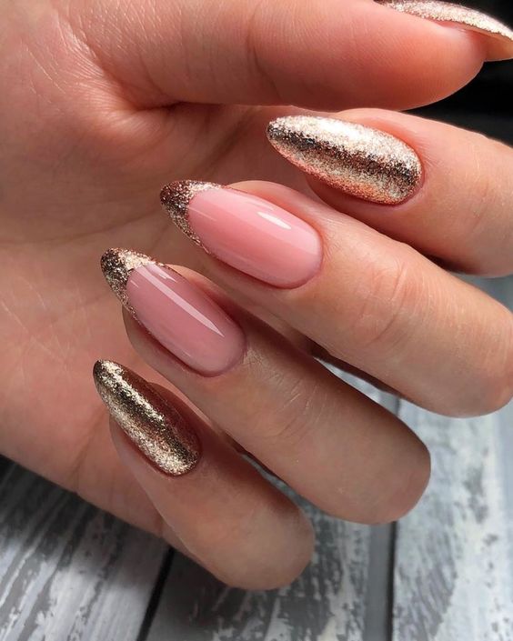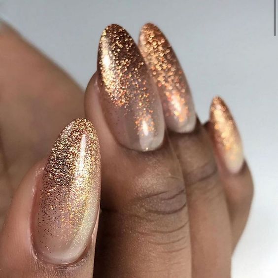 For the bride who desires a touch of drama, these long nails with a stiletto point sparkle with a gradient of gold glitter. They transition from a pale pink and base into a rich gold tip, offering a dazzling effect that captures the joyous spirit of a wedding celebration.