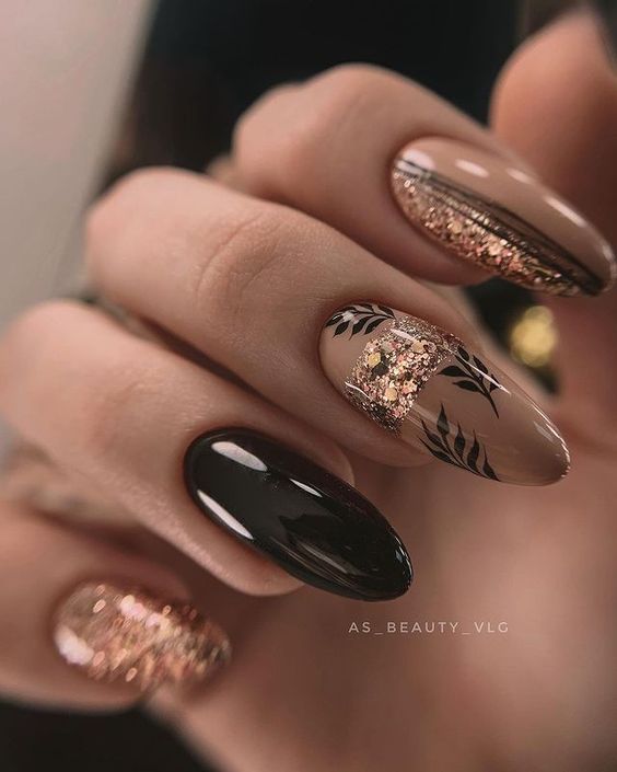 In a stunning display of contrast, these nails feature a bold black and glossy base, complemented by intricate gold detailing and a sprinkle of gold wedding nails glitter. This look is reminiscent of the rich hues of autumn, perfect for a wedding set against the backdrop of fall foliage. The oval shape adds a classic touch, making it a timeless choice.