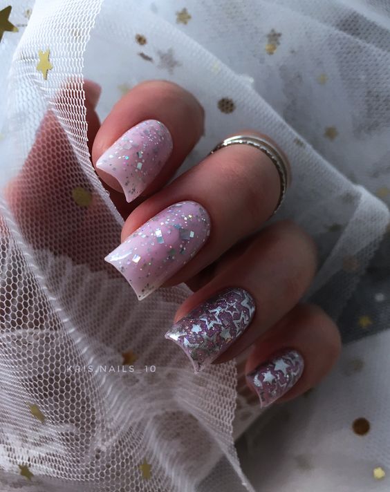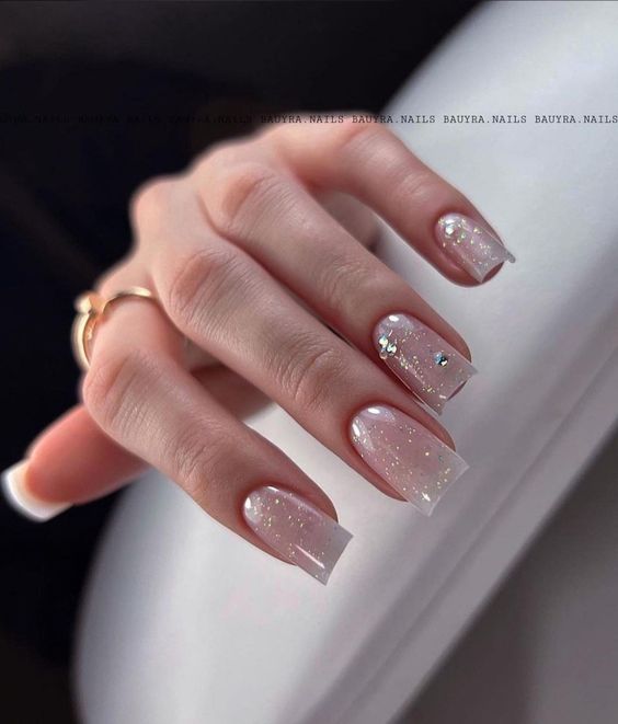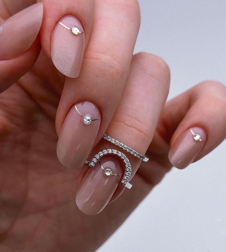 This nail design exudes a regal elegance with its matte lavender base and a delicate crescent of silver gems. The bride pink hue is a soft alternative to traditional pink, while the gemstones offer a hint of opulence. The medium length and square shape make it a versatile choice for any bride or bridesmaid gold, aiming for a balance of comfort and high fashion.