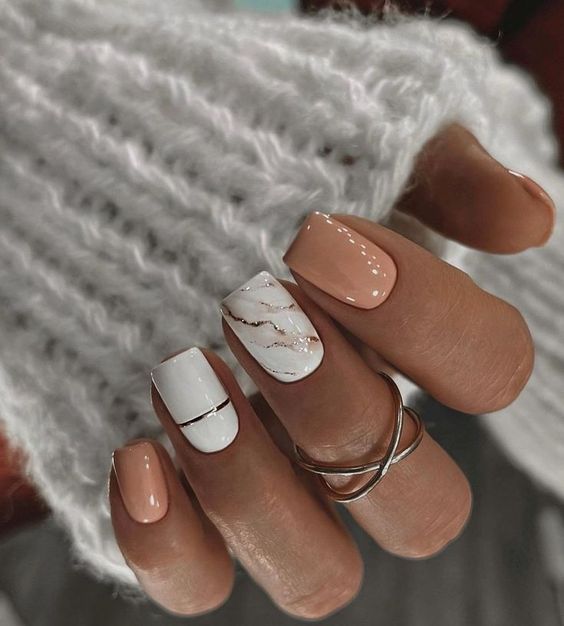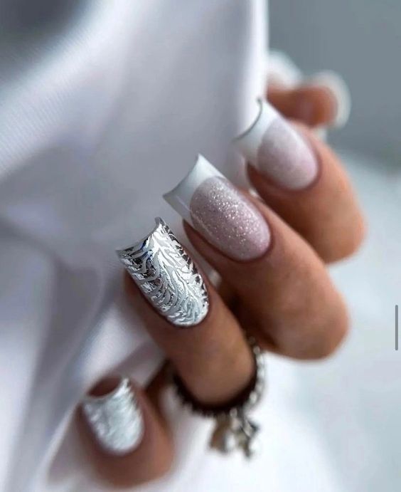 Lastly, we have a nail design that makes a bold statement with its textured silver foil on a sheer white base. The accompanying glitter and matte nails create a cohesive yet varied look, embodying a fall bride’s diverse tastes. This long stiletto design is for those who dare to be different, perfect for a bride rose gold or a bridesmaid gold looking to make a memorable impression.