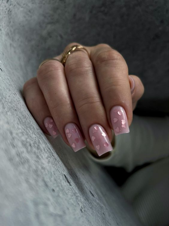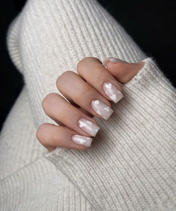 Embodying the essence of bridal elegance, this nail design features a sheer pink base adorned with delicate white hearts. It’s a testament to love and a subtle nod to the romantic occasion. The pink hue is soft and understated, providing a classy and feminine touch that would pair beautifully with both the bride and the bridesmaid pink dresses. The design, perfect for medium to long nails, offers a short extension past the fingertip, suitable for those who prefer practicality without compromising on style.