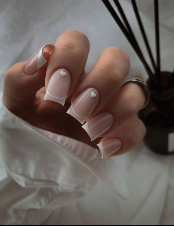 Embrace the romance with this understated design featuring classic French tips adorned with tiny hearts. The subtlety of the hearts adds a romantic touch, ideal for the bride who cherishes delicate details. This short and almond shape is for the romantic at heart, who appreciates timeless elegance.