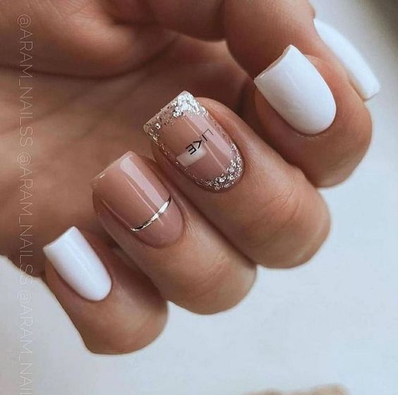 Blending simplicity with a touch of sparkle, this design features a nude pink base with alternating white and glitter accents. It’s a classy choice for a bride looking to combine modern trends with timeless elegance. The rounded coffin shape is both contemporary and practical, suitable for brides who prioritize both style and ease on their wedding day.