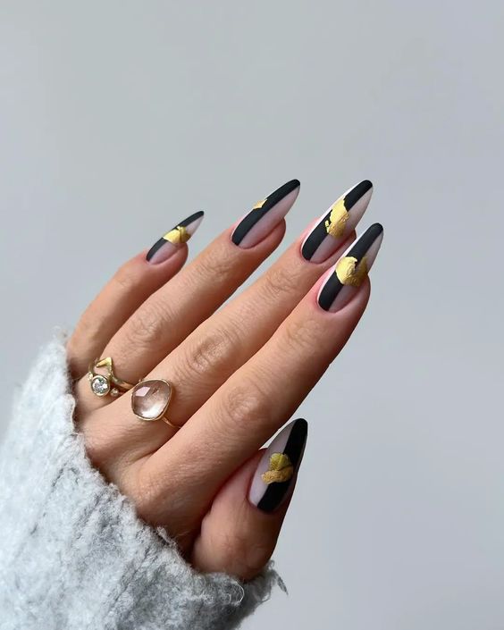 For the bride who dares to be different, these black and gold nails make a bold statement. The long stiletto shape exudes confidence and sophistication, while the gold foil adds a luxurious touch to the design. This style would be a stunning complement to a wedding outfit with a modern edge or even a dramatic new years or birthday celebration, embodying the spirit of a bride who celebrates her uniqueness.