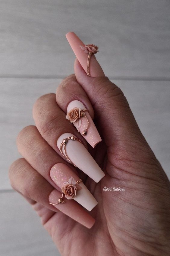 Indulge in the romance of a wedding with these long coffin nails, beautifully adorned with miniature roses and gold bead accents. The nails are painted in a soft pink glitter that shimmers subtly, reminiscent of a bride’s blushing cheeks. These nails not only celebrate the union of hearts but also add an air of classy sophistication that would pair beautifully with a lace dress, making them a poetic choice for a summer wedding.