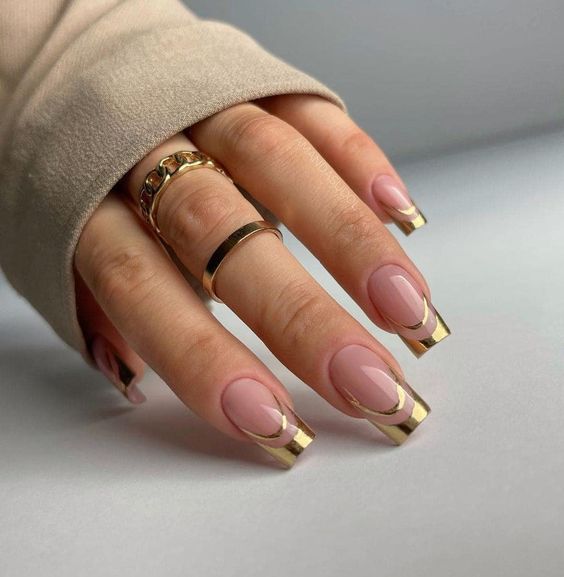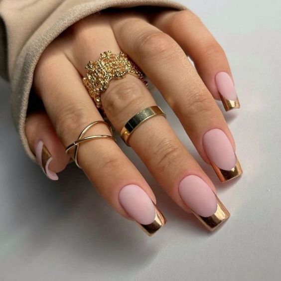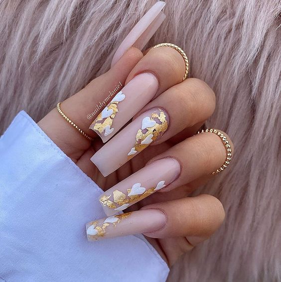 Bold geometry meets bridal grace in these long square nails. The matte pink base is enhanced with gold metallic tips, creating a look that’s both trendy and classy. It’s a nod to the bride who adores modern art and wishes to incorporate that love into her wedding day style. These nails would also be at home at a prom or new years event, where fashion-forward design is celebrated.