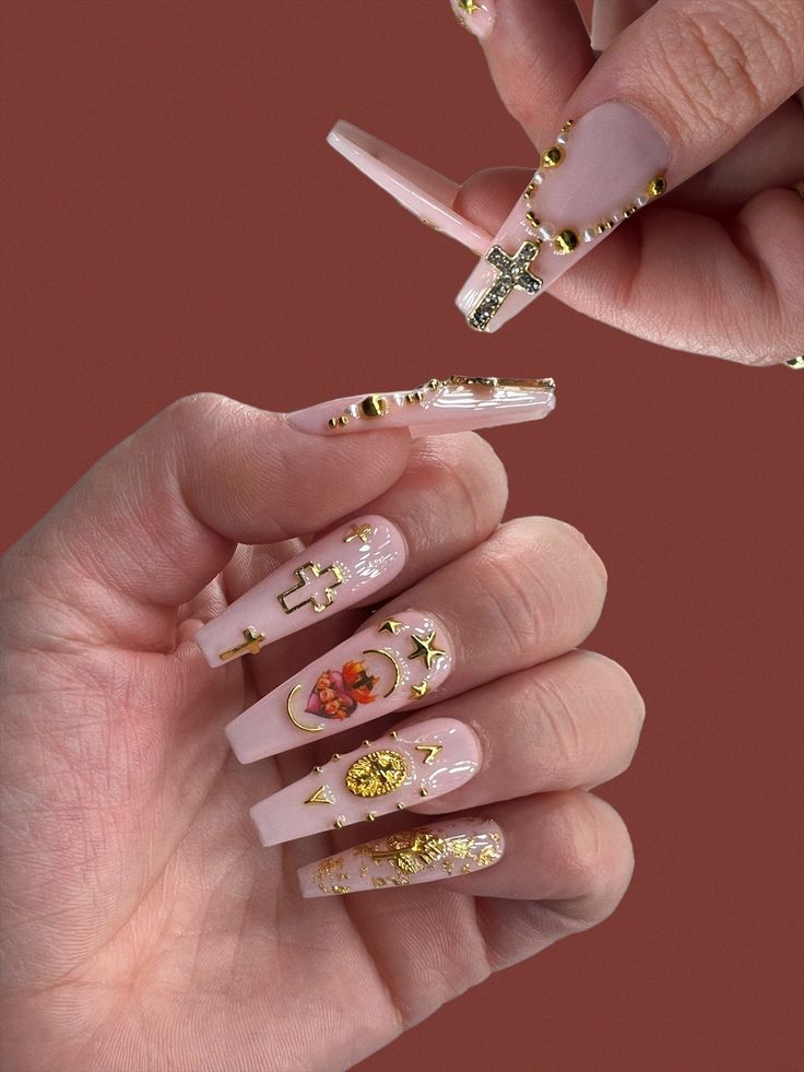 A tribute to the intricate beauty of Hindu wedding traditions, these long nails are a masterpiece of artistry. Embellished with gold foil, delicate crosses, and miniature religious iconography, they exude a sacred charm. The gold accents set against the blush base make a statement of faith and fashion, ideal for a bride who wants to honor her heritage in a classy and elegant way.