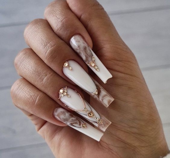 For a touch of natural elegance, these long coffin nails feature a white and gray marble effect, beautifully complemented by gold studs and chains. This design exudes a classy sophistication, perfect for a bride looking for a unique yet elegant addition to her wedding attire. The intricate details of these nails would also make them suitable for a summer gala or an Xmas gathering.