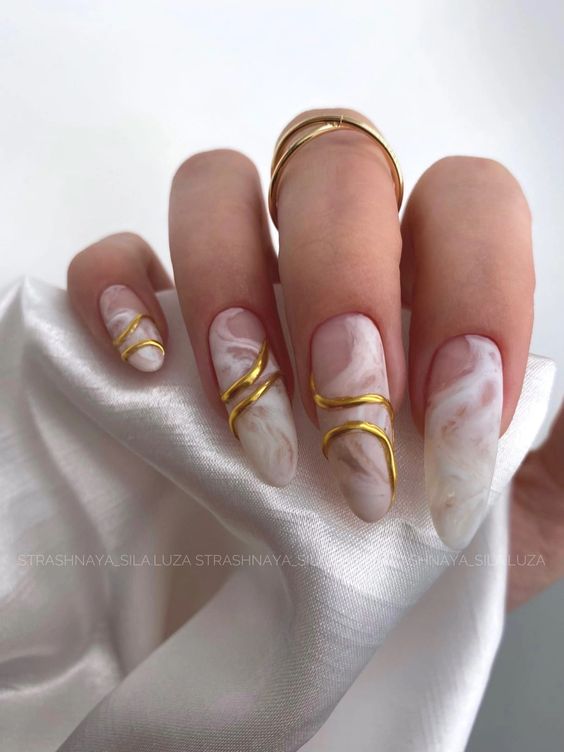 The gentle swirls of white and nude tones are accented with thin, precise lines of gold on these long oval nails, creating a simple but elegant visual feast. This design is for a bride who appreciates the beauty in subtlety and seeks a classy touch that complements her wedding gown without overpowering it. The nails evoke a sense of serenity and grace, ideal for a summer wedding or a new years eve celebration.
