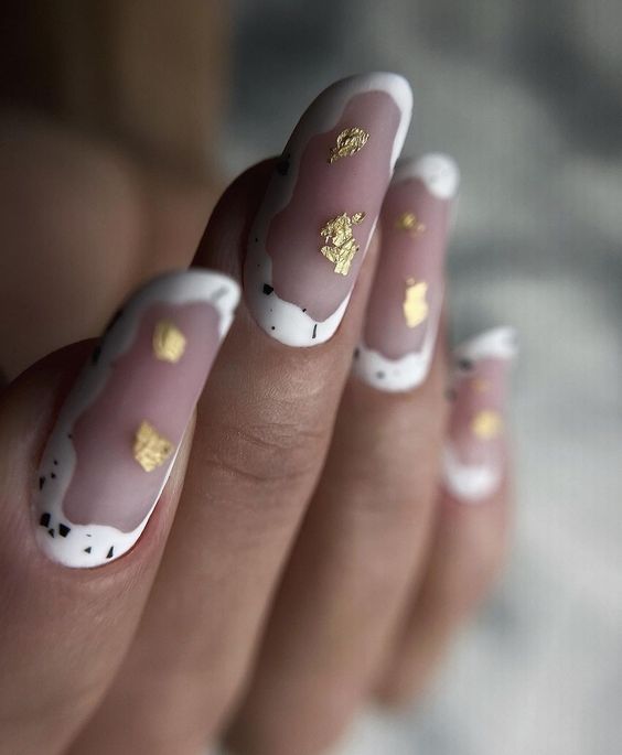 Capturing the essence of the blush of a bride, this nail design features soft pink hues with gold flake accents, creating an air of romance and sophistication. The long and oval shape provides an ample canvas for the whimsical design, with every gold detail adding a touch of luxury to the bride’s ensemble. This style is perfect for a bride who desires a classy, elegant look with a hint of playful charm.