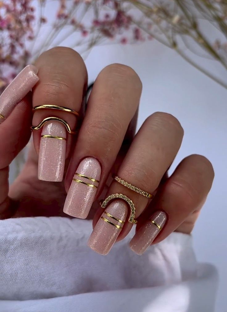 Moving towards a minimalist yet captivating approach, these short square acrylic nails are a testament to the beauty of understatement. The sheer pink base is kissed with a hint of glitter, and the gold is introduced in slender, tasteful bands that hint at a classy yet trendy aesthetic. This design is a nod to the elegant nature of the wedding, with a simple execution that would complement any dress, making it a versatile choice for the bride.