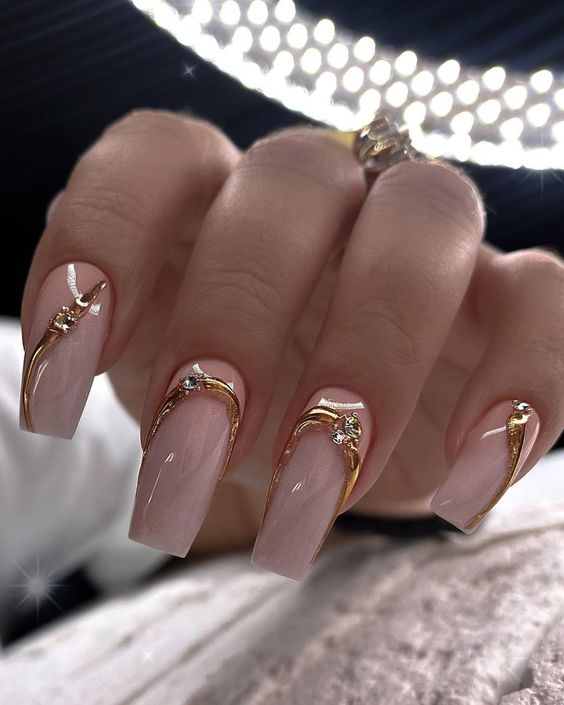 Elevating the stakes, this set embodies a luxurious champagne acrylic undertone adorned with bold gold accents. The elongated coffin shape adds drama and sophistication, allowing for more surface area to showcase the captivating design. The inclusion of tiny pearls alongside the golden details evokes the essence of a wedding celebration, making each nail a tiny toast to love and unity.