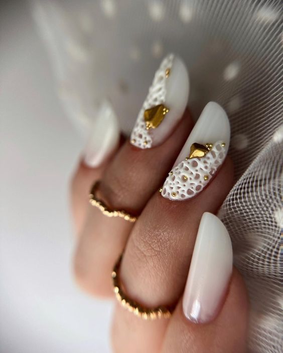 Embrace the luxury of and white nails paired with lavish gold foil in a long oval shape. The intricate embossed details suggest a touch of classy royalty, perfect for a winter wedding or a Christmas celebration. This design is for the bride who desires a simple base with an elegant flourish, mirroring the pure and festive spirit of her special day.