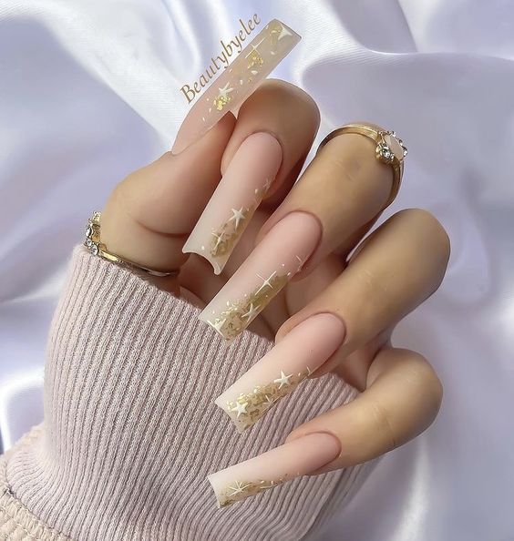 Here’s a design that speaks to the stars—a long set of nails that combines a sheer nude base with gold starry foil, evoking a celestial theme. It’s a trendy and cute nod to a night of celebration, whether it be a Christmas gala or a prom. These nails would perfectly accent a bride’s hand, holding a bouquet under a starlit sky, offering a subtle yet enchanting glitter simple touch to the elegant bridal look.