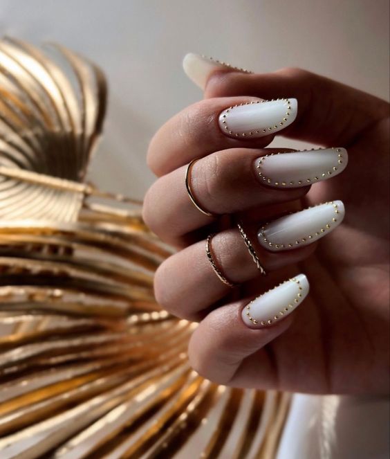 Sophistication meets simplicity in this classy design that showcases and white nails with a precise gold trim. The medium oval shape maintains an air of traditional bridal beauty, while the gold detail adds a modern twist. These nails are a testament to a bride’s impeccable taste, mirroring the precision and beauty of a well-tailored wedding gown, suitable for any season, from a winter wonderland wedding to a summer soiree.