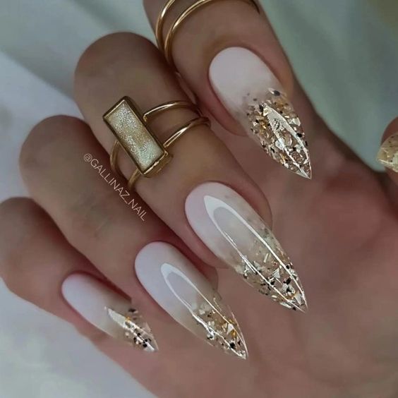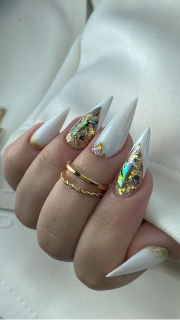 For the bride who wants to dazzle with every gesture, these stiletto acrylics are a masterpiece of shimmer and shine. Encrusted with gold and green iridescent flakes, they catch the light like precious gems. The alternating white tips speak to a classic French design, updated for the modern bride. These nails could complement a boho-chic gown or add a pop of fantasy to a simple dress, making them versatile for various wedding themes.