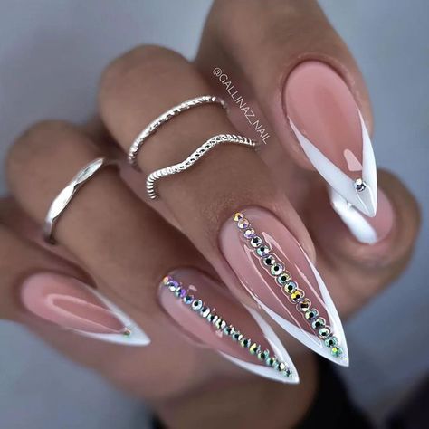 For the bride who desires a sleek and fancy aesthetic, these stiletto nails are a dream. The pink base is enhanced with a white V-tip, adorned with a cascade of colorful rhinestones, creating a jewel-like effect. They’re perfect for adding a touch of glamour to a simple gown or completing a boho-chic look with a hint of sparkle.