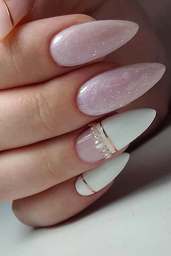A simple yet sophisticated choice for a bride or bridesmaid, these creamy white nails with gold accents offer a touch of luxury without overpowering. The oval shape is both classic and contemporary, appealing to a wide age range. These could be the go-to for a short nail lover or someone looking for a medium length that’s practical yet elegant.