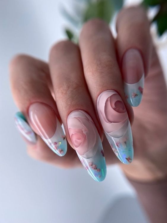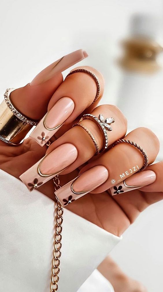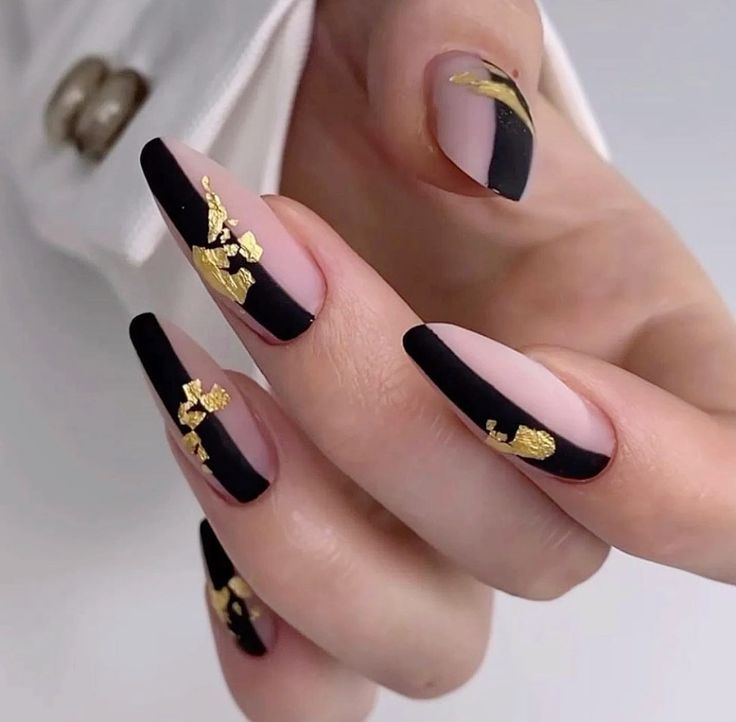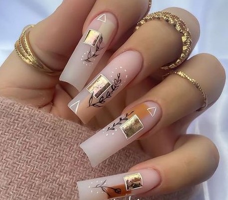 Soft pink hues meet luxurious gold foil in this set of medium-length ballerina nails. Ideal for a spring or summer wedding, they offer a breath of fresh air and a dash of romance. These nails would be a charming choice for a bride or bridesmaid whose attire includes pastel tones or gold detailing.