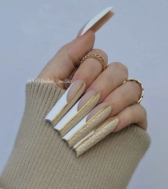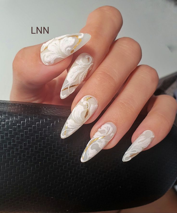 A bride with a love for intricate designs will adore these long almond-shaped nails. The white canvas is graced with raised white swirls and delicate gold leaf accents, embodying a touch of Renaissance art. These nails would beautifully complement a lace wedding gown, echoing the fancy and detailed patterns in the fabric.