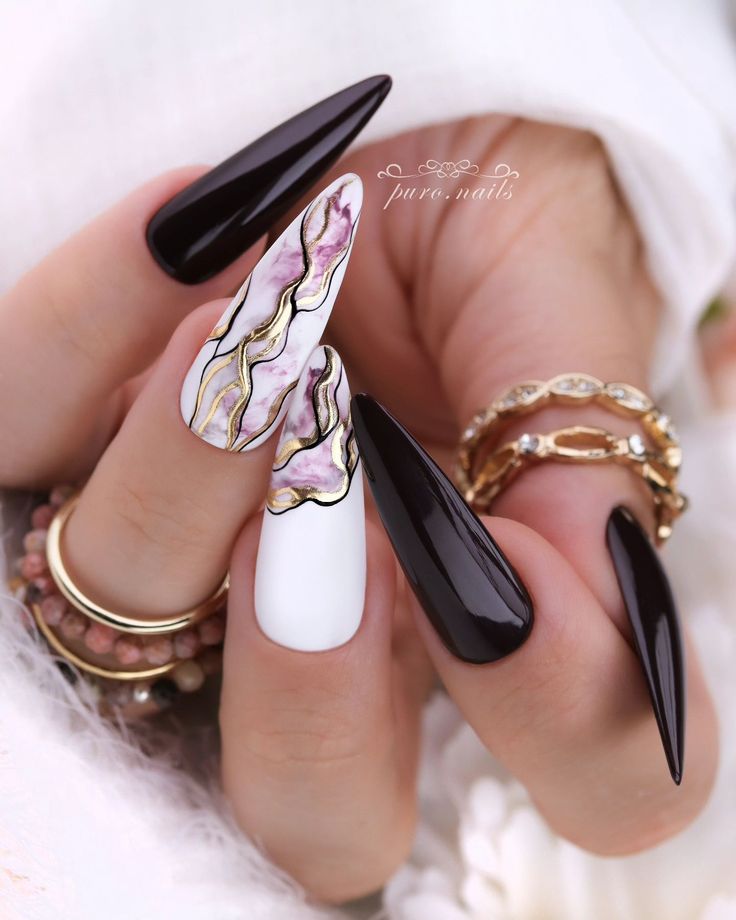 For the bride with a flair for the dramatic, these long acrylics pair a glossy black with a marble effect. They’re bold, they’re beautiful, and they’re unabashedly unique. This design could be perfect for a winter wedding or for the bride who embraces dark elegance. They would pair exquisitely with a black or deep purple dress in a non-traditional wedding.