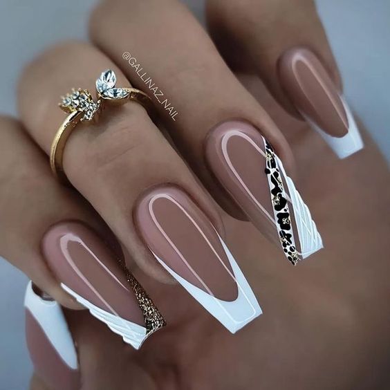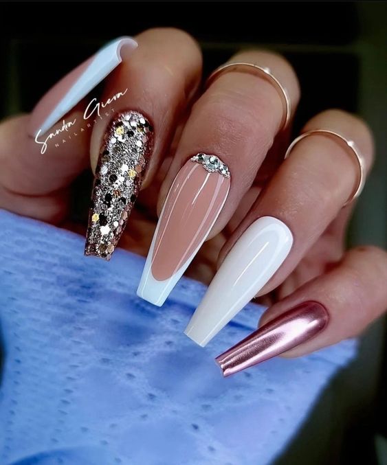 A playful and creative bride will be drawn to these coffin long nails, featuring a mix of pink and white tones, metallic foil, and rhinestone embellishments. This design is a canvas of fancy wedding artistry, ideal for a bride looking for a French tip with a twist or a bridesmaid wanting to add a sparkle to her ensemble.