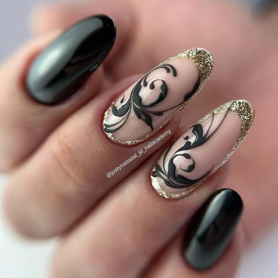 For the bride who embraces bold contrasts, these long nails offer an exquisite blend of glossy black and matte finishes, with gold glitter accents that provide an opulent flair. The stiletto shape adds an edge to the bridal look, making it a statement piece that could pair with a fancy gown or add a striking touch to a simple silhouette.