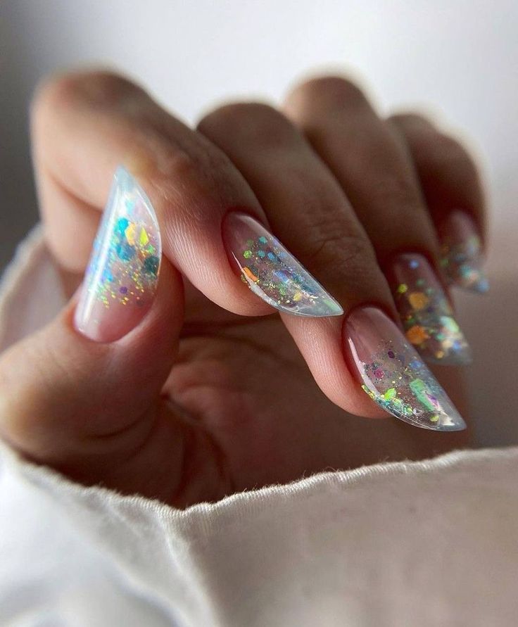Embracing the magic of the moment, these nails capture the essence of a dreamy wedding with their iridescent sparkle. A sheer base adorned with flutters of holographic glitter creates a cute and celestial look. They’re perfect for a Christmas wedding, reflecting the twinkling lights and joyous spirit.