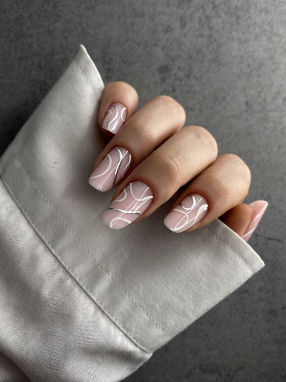 The soft pink hue of these nails sets a romantic and elegant pink tone. The intricate white line art adds a bespoke touch to the manicure, making each nail a canvas of artistry. These nails would be a delightful choice for a spring wedding or to add a hint of color to a neutral bridesmaid palette.
