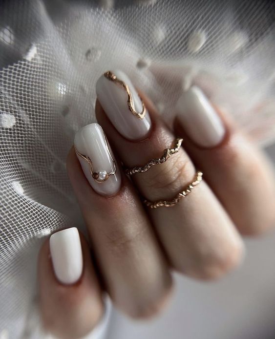 Immaculate white nails adorned with gold embellishments speak to the luxurious side of bridal aesthetics. The elegant acrylic provides a canvas for creativity, allowing the gold to stand out in a tasteful and classy manner. This design would shine at a winter wedding, resonating with the purity of a Christmas scene.