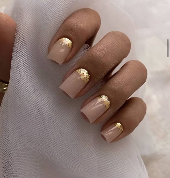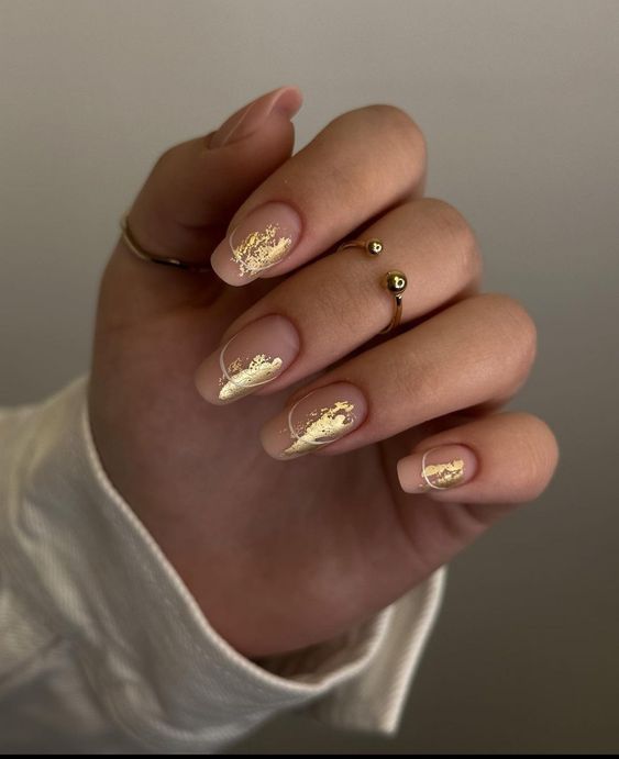 The neutral background of these nails provides a perfect stage for the shimmering gold leaf. Each piece is carefully placed, creating a luxurious and elegant gold motif that’s classy and unmistakably chic.