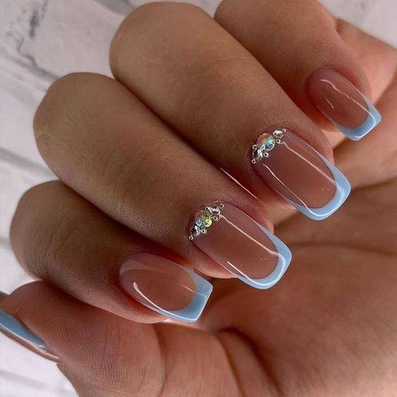 With a simple yet striking design, this manicure introduces a pop of color with its blue edging. It’s a nod to the dusty blue trend, adding a subtle touch of color that would be perfect for a beachside wedding or to complement a navy blue themed nuptial.