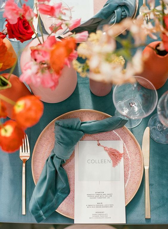 Imagine a setting that speaks to the heart with its understated grace. A simple matte pink plate rests upon a textured charger, bringing a touch of sage green and blush wedding decor to life. The elegant table name card, adorned with a tassel, whispers the guest’s name, while flowers in shades of red and pink bloom casually in a terracotta vase. The entire arrangement exemplifies a modern minimalist aesthetic that combines classy simplicity with a personal touch.