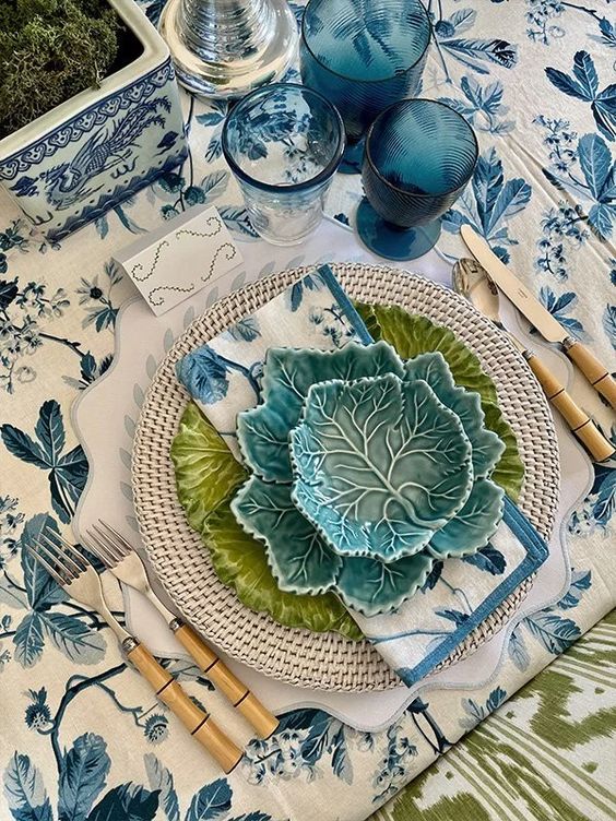 This setting brings to the table a breath of coastal air, combining navy blue and sage green tones with natural textures. The round cabbage leaf plates add an organic touch to the minimalist design, while the greenery of the eucalyptus completes the look. It’s a blend of garden freshness with seaside serenity, creating a simple yet classy spring wedding decor.